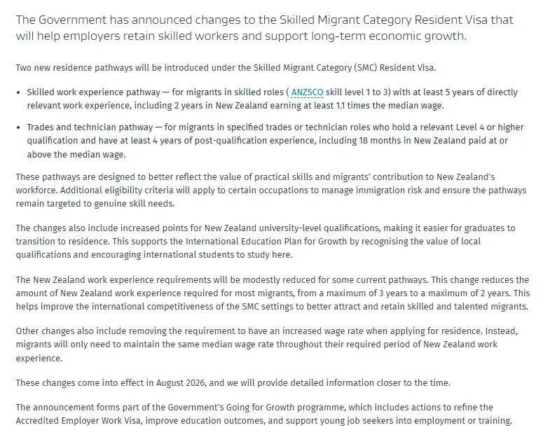 9月23日,新西兰政府宣布对技术移民类居民签证(Skilled Migrant Category Resident Visa,简称 SMC)进行调整。