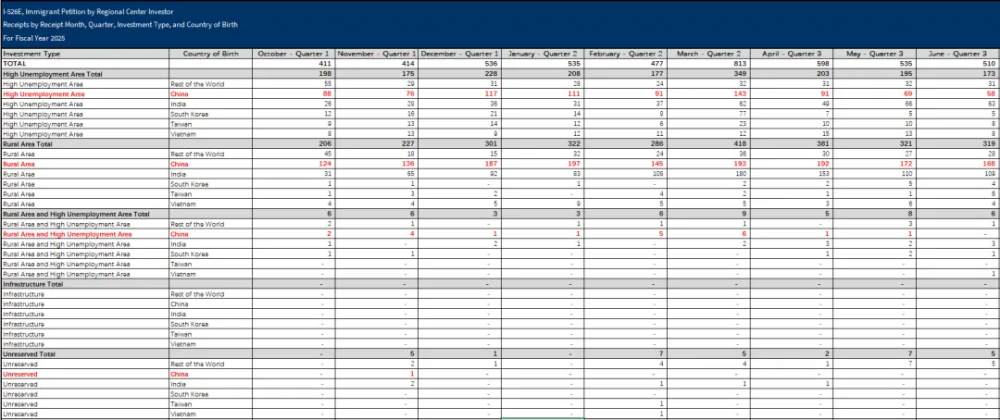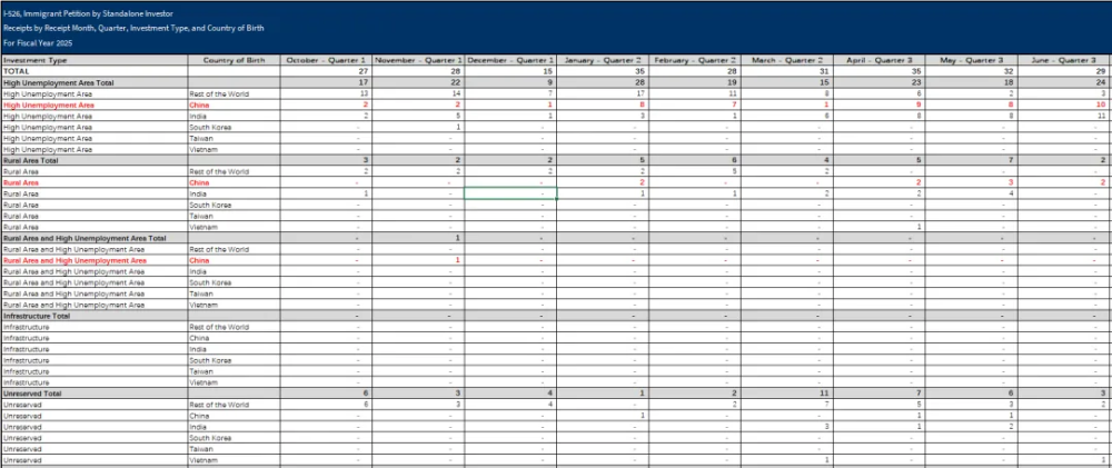 此次美国移民局首次公开了自2022财年起,I-526/I-526E的申请数据,并按照国别进行了划分,还细化到了项目类别、月份: