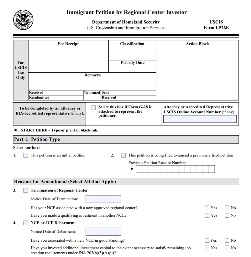 根据《移民和国籍法》(INA),一名或多名参与区域中心计划的合格移民共同投资的投资者使用I-526E表格向美国移民局申请移民身份。如果投资者投资的区域中心、新商业企业或创造就业的实体被终止或被禁止参与区域中心,区域中心投资者也可以使用I-526E表格报告任何必要的修改,以保证资格的持续性。