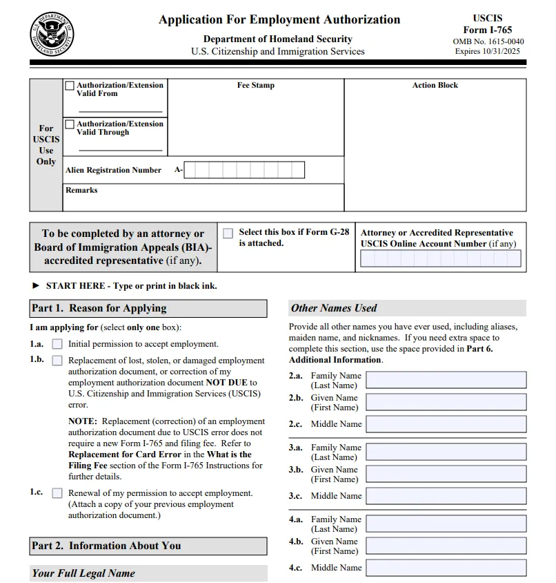 I-765是一种表格,用于由外国人填写申请就业授权。这个表格也被称为就业授权申请表。在美国某些非移民签证类别,如F-1、J-1、M-1或H-4签证的持有人可能有资格使用I-765表格申请就业授权。此外,正在调整其永久居留状态的个人也可以使用此表格申请就业授权。I-765申请要求申请人提供个人信息、移民身份详情和就业历史。申请人还必须提供他们合法工作的证明,并支付所需的申请费用。提交I-765申请后,申请人将收到一份收据通知,确认其申请已被美国公民和移民服务局(USCIS)收到。I-765的处理时间因申请人的情况而异,但通常需要数月时间。一旦I-765申请获批,申请人将收到一份就业授权文件(EAD),允许他们在指定的时间内合法地在美国工作。外国公民也可以按照I-765表格中的指南申请社会安全号码和社安卡。