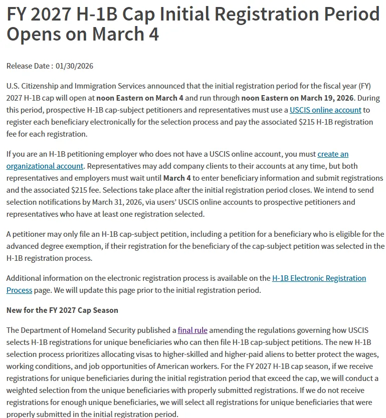 美国移民局(USCIS)近日正式公布了 2027 财年 H-1B 抽签安排。