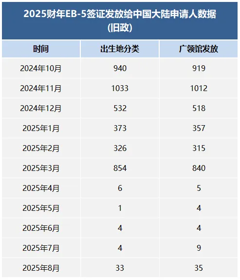 1、旧政可用签证逐渐被消耗 EB-5每年签证数量是固定的,旧政类别在过去几年积压较多申请,一旦配额消耗到一定阶段,月度发放量自然会下降。