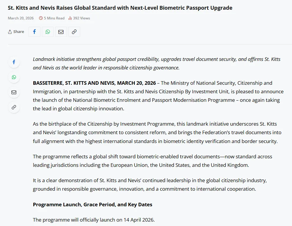 此次变革,圣基茨官方给出的原因是提升护照安全性、对标国际标准、强化身份认证体系。